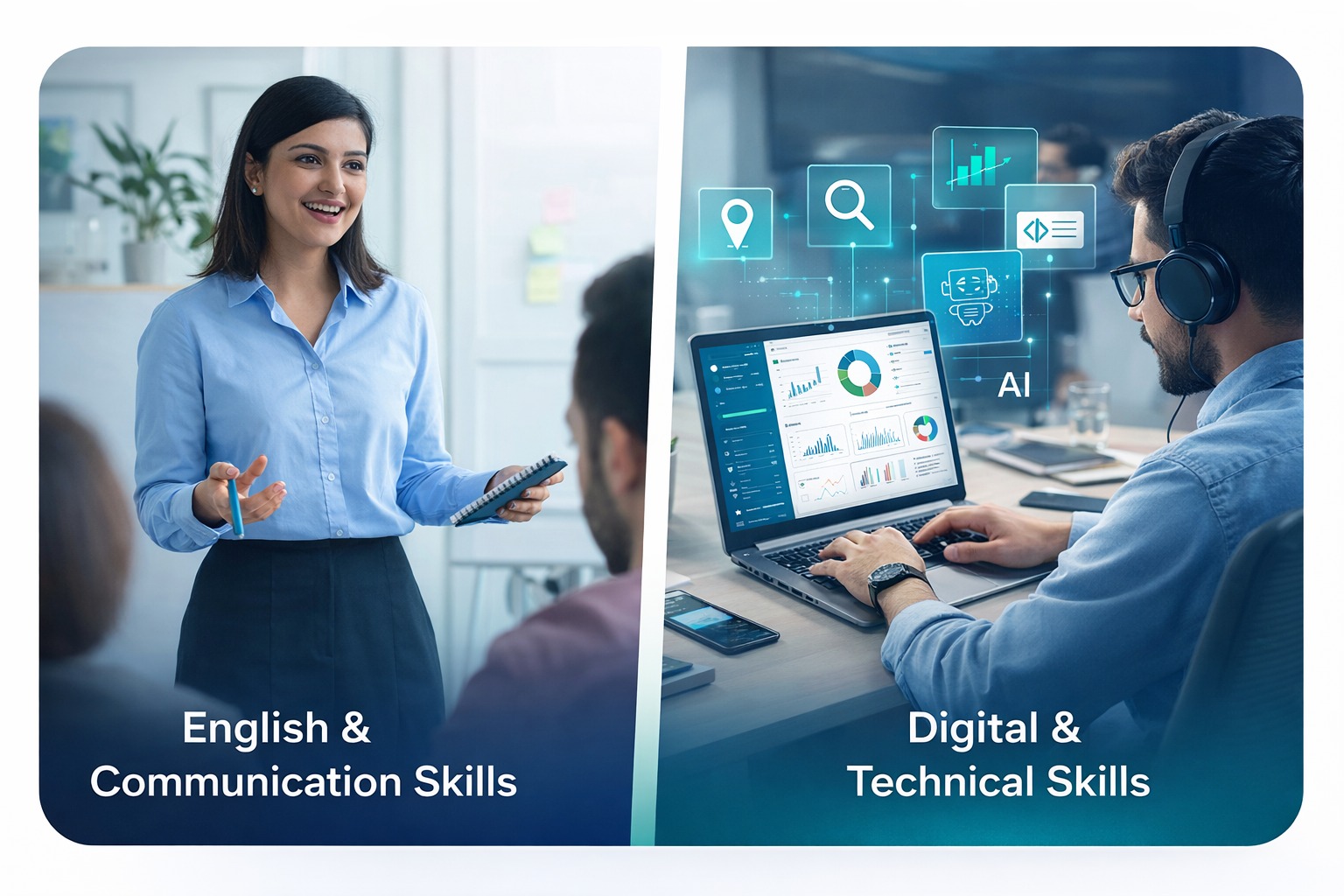 We offer English Communication Programs and Digital and Technical Skill Courses such as Digital Marketing, Data Analytics, UI/UX, Excel, AI Tools, and more.