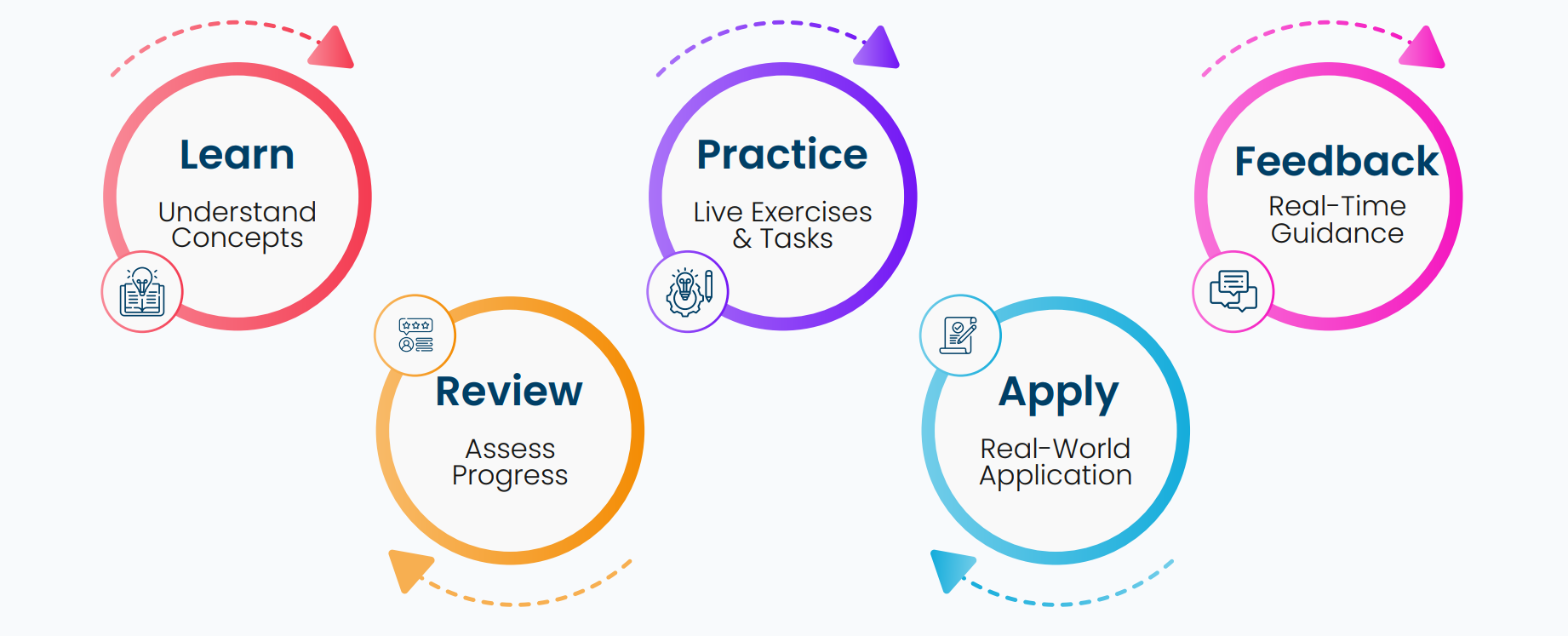 Real-time trainer interaction with active learner participation. No recorded videos - only live sessions for maximum engagement.